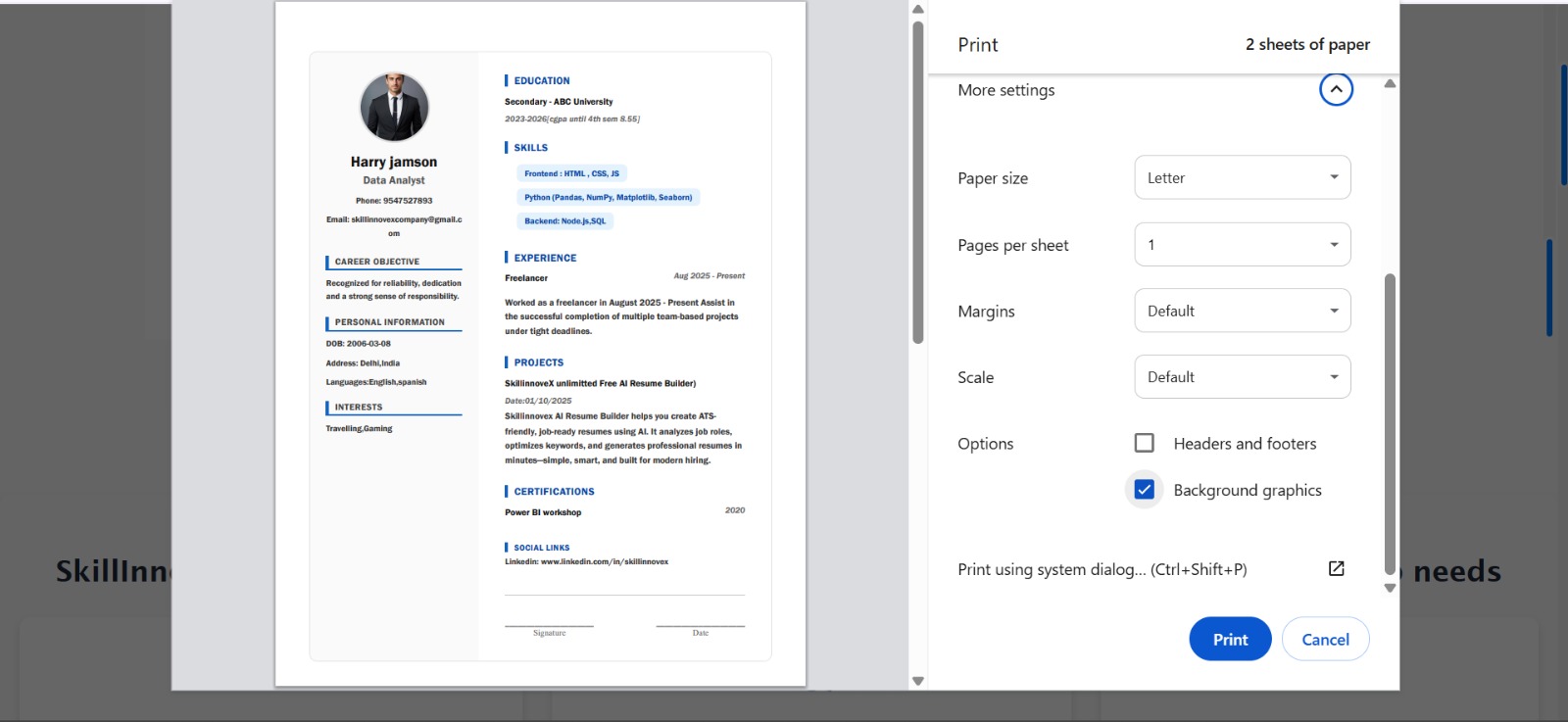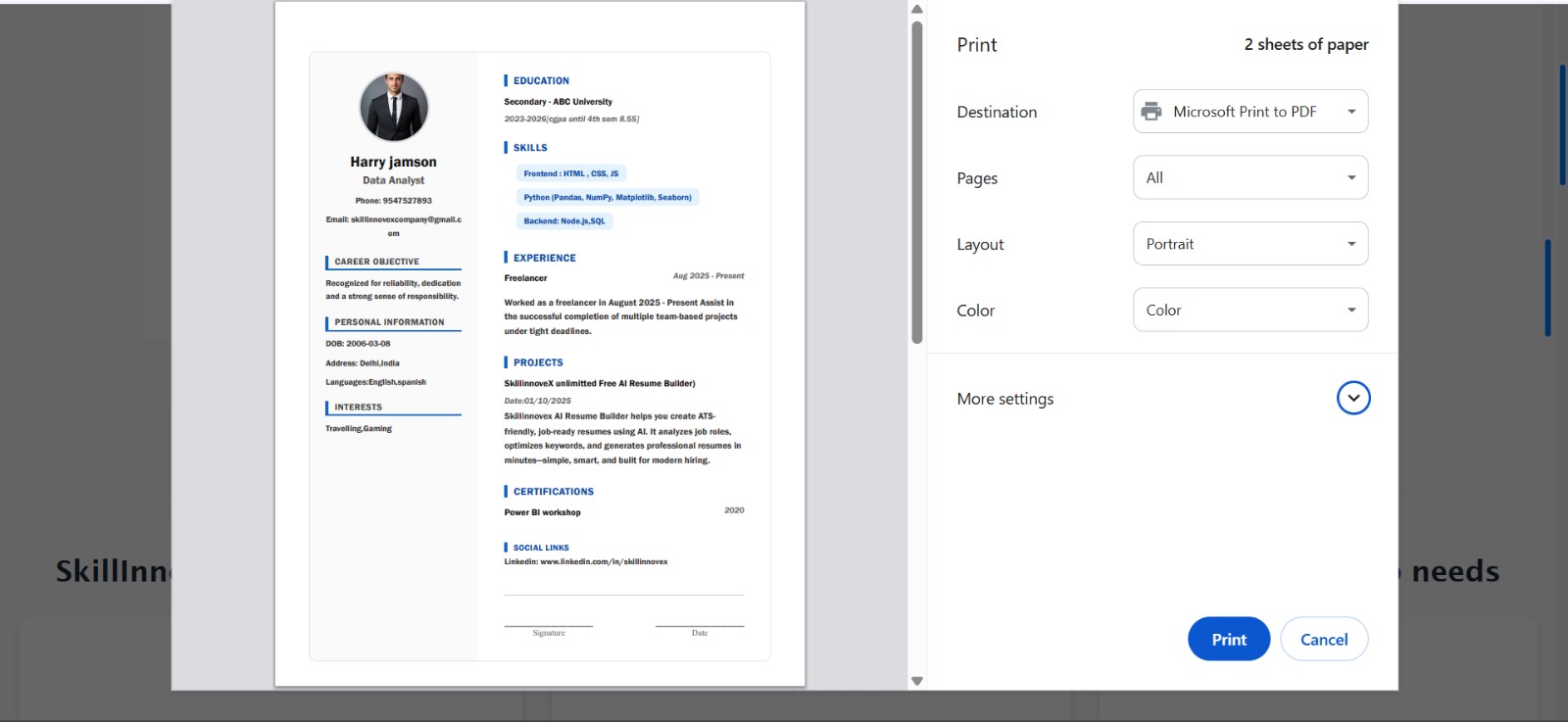 Download your resume quickly in PDF format. Unlike other platforms, SkillInnoveX gives you unlimited free downloads with no hidden charges.